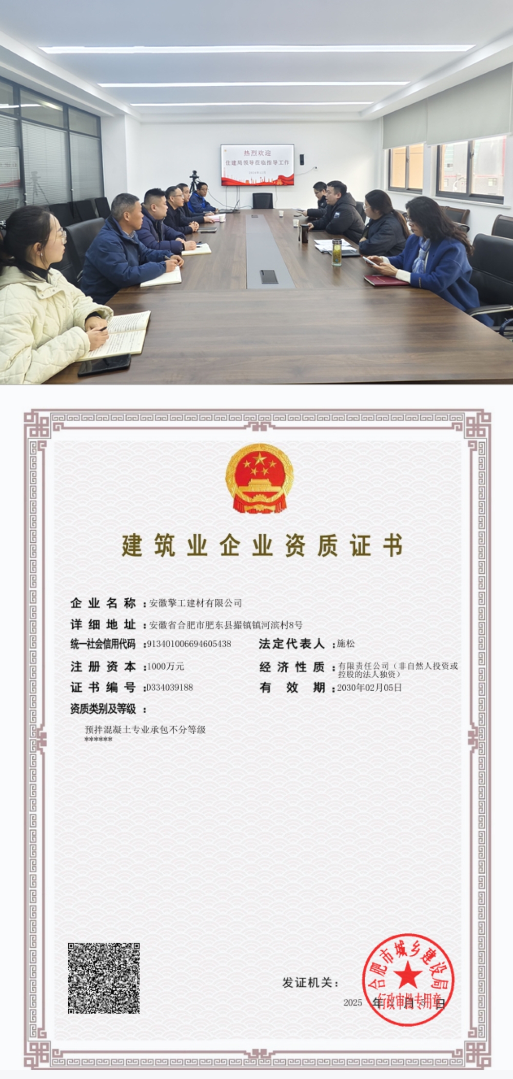 近日,擎工建材順利通過合肥市住建局、肥東縣住建局聯(lián)合檢查,成功完成企業(yè)資質(zhì)延續(xù)工作,這一重要資質(zhì)的延續(xù),不僅標(biāo)志著企業(yè)在設(shè)備管理、人員持證及規(guī)范化運(yùn)營方面達(dá)到了行業(yè)高標(biāo)準(zhǔn),也為企業(yè)的持續(xù)發(fā)展奠定了堅(jiān)實(shí)基礎(chǔ)。