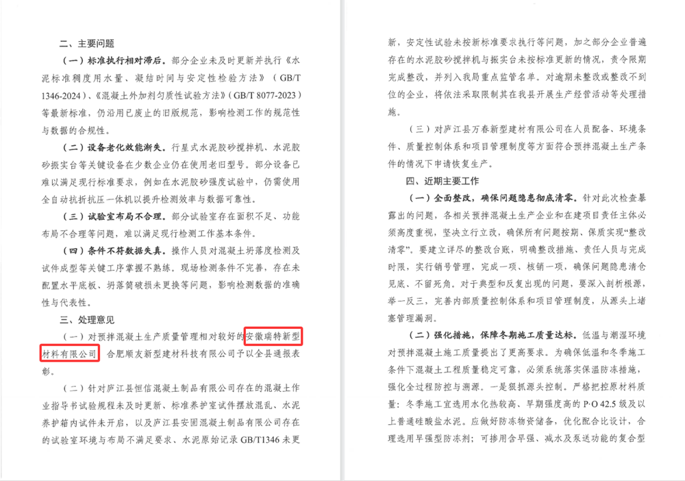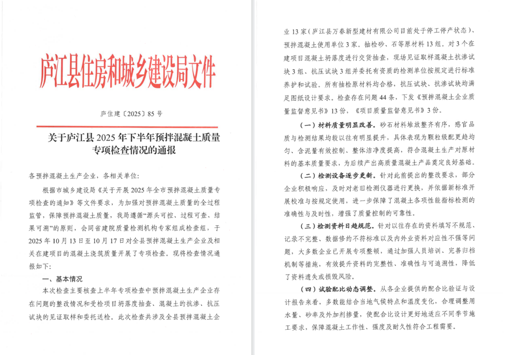 近日,廬江縣住房和城鄉(xiāng)建設(shè)局發(fā)布《關(guān)于廬江縣2025年下半年預(yù)拌混凝土質(zhì)量專項(xiàng)檢查情況的通報(bào)》,安徽建工瑞特新材料科技有限公司憑借卓越的質(zhì)量管理表現(xiàn)再獲通報(bào)表揚(yáng),繼今年四月獲評(píng)后,此次再獲表彰,實(shí)現(xiàn)質(zhì)量榮譽(yù)"雙豐收"。